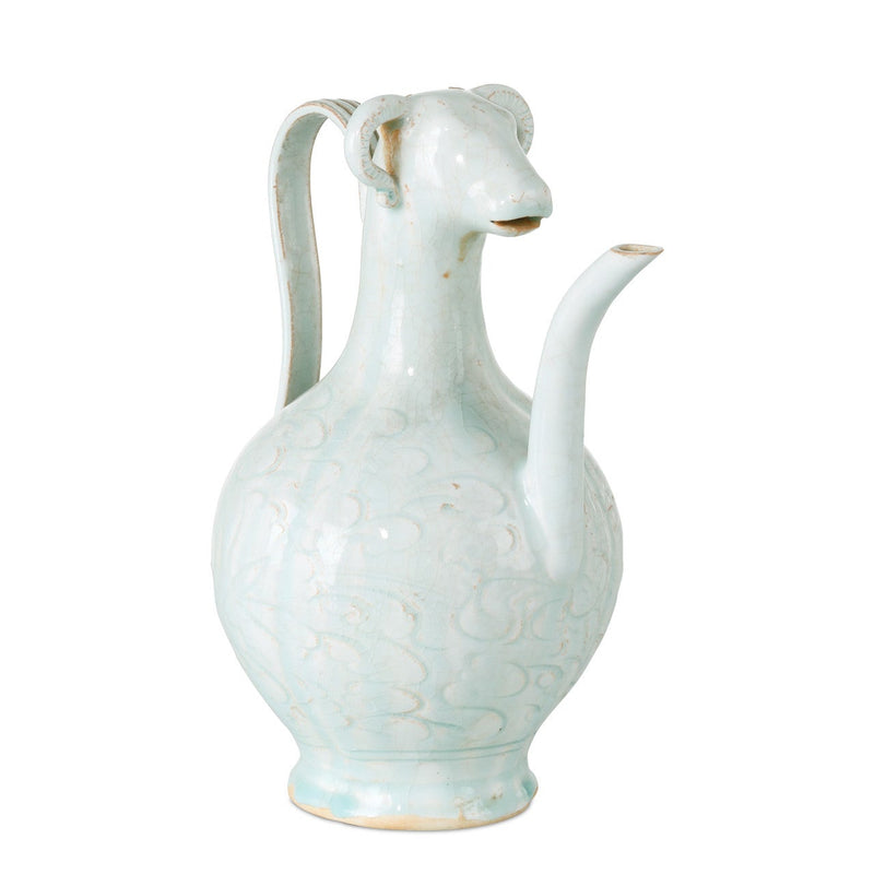 Inspired by ancient ceremonial art, the Ritual Small Hunting Bottle includes two striking Bottles that are modeled after Ming Dynasty liquor Bottles taken on the hunt. The vessel features a sculptural animal head detail with great historical significance. Crafted in porcelain with a soft celadon green glaze, the surface has a delicate crackle effect that enhances the antique look and feel. Due to the artisanal finish, the surface of each accessory could differ slightly.