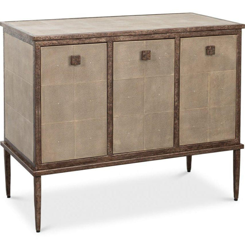 Add a touch of elegance to your home with the antique charcoal grey shagreen leather-wrapped cabinet. This piece is framed and accented in antique brass frosted metal, providing a sophisticated look that suits any room in your house. With its three hinged doors, it offers ample storage space for your essentials, ensuring your living area remains tidy and stylish. The cabinet's adaptable size makes it a versatile addition, blending style and functionality seamlessly.