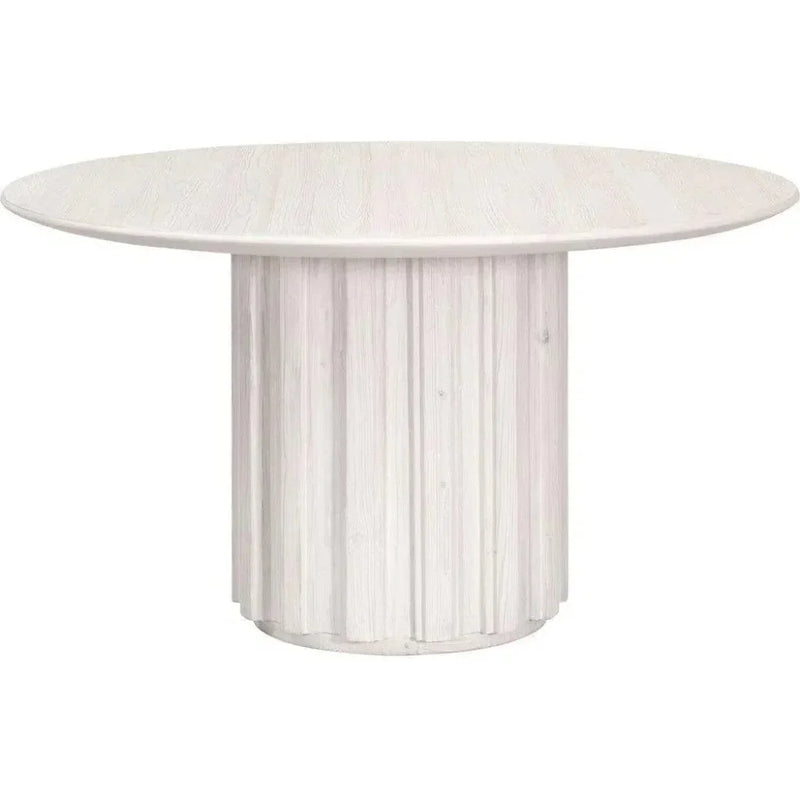 Crafted from sustainable pine veneer and reclaimed pine wood, this table exudes rustic charm while also promoting sustainability. The whitewash finish highlights the natural beauty of the wood, creating a warm and inviting atmosphere for every meal. Its round top features a stunning plank veneer design with an angled edge, while the pedestal base boasts decorative wood fluting that adds a touch of refinement. With a diameter and height of 54 inches and comfortably fitting six diners, this table is both beautiful and practical for gatherings and daily meals. Add a touch of luxury to your home with our exquisite Roma 54" Round Dining Table - a perfect fusion of timeless elegance and sustainable design.
