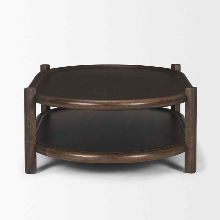 The Romi Coffee Table brings a touch of elegance to any living space with its timeless design. Crafted from solid mango wood, it features a rich, dark brown stain that highlights its natural beauty. The oval tabletop, surrounded by a curved rim, adds a unique touch to the otherwise classic design. Beneath the tabletop, a matching bottom shelf provides additional space, perfect for displaying decorative items or storing magazines. The rounded legs add a refined touch, ensuring stability and style. This dual-tiered table is both functional and stylish, making it a versatile addition to any home.