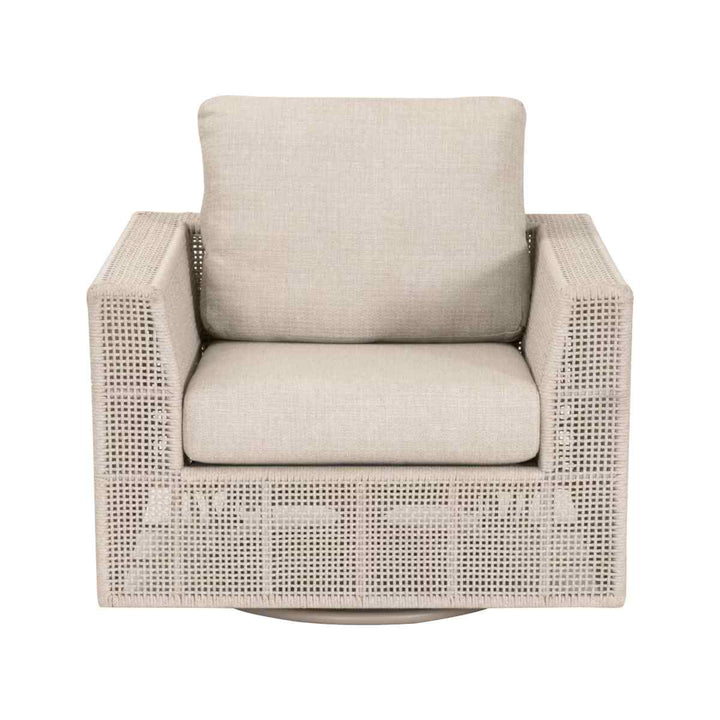 Introducing the Tropez Outdoor Swivel Rocker - a versatile and stylish addition to elevate your outdoor experience. Handcrafted with an intricate rope weave design and aluminum frame, this transitional style chair exudes luxury and sophistication. Its natural weathering process adds a touch of exclusivity and promises to give each chair a unique and distinguished appearance over time. With its versatile design, this chair can be used to create eye-catching focal points in any room, while complementing the other furniture and standing out as its own unique piece.