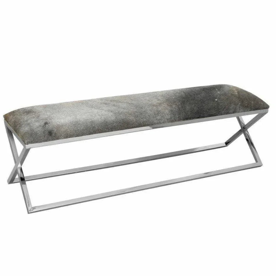 Indulge in luxury with the Rossi Bench from Moe's Home Collection Furniture. Part of the Grey Contemporary collection, it features opulent cowhide upholstery and a sleek stainless steel frame, exuding pure elegance and sophistication. Perfect for glamorous living spaces and entryways. Introducing the lavish Rossi Bench, part of Moe's Home Collection Furniture's Grey Contemporary collection. Embodying pure elegance and sophistication, this bench boasts a sleek stainless steel frame and opulent cow hide upholstery. A must-have for any glamorous entryway or living space.