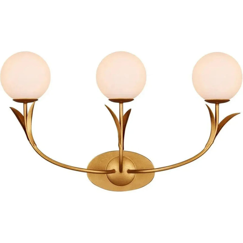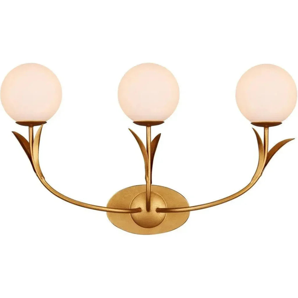If the Rossville Triple-Light Wall Sconce didn't have such contemporary lines, it could be a throwback to a nostalgic time when globe lights proliferated in ice cream parlors and theaters. But this nature-inspired gold sconce is more modern in its makeup with the thin arcing leaves that flow from it. Made of wrought iron in a contemporary gold leaf finish, the bobeches balance its three white glass globes brilliantly.