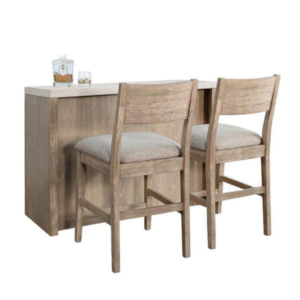 Mindi wood gives this bar set a natural and inviting look, perfect for your home gatherings. The set includes a sleek bar console in a warm Light Wheat finish that shows off the wood grain beautifully. You also get two comfortable upholstered barstools to complete the setup. Behind the bar, two open shelves offer plenty of room for your bottles and accessories, while a built-in stemware rack keeps your wine glasses neatly organized and easy to grab. This setup is great for entertaining guests or enjoying a quiet evening at home, fitting nicely into any dining or living space with its modern style and practical design.