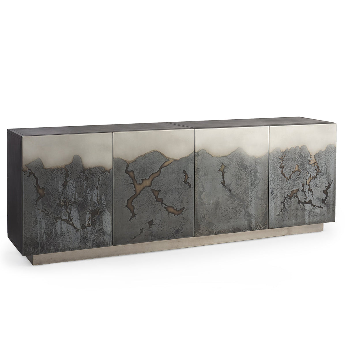 The Roxdale Acid Wash Iron Sideboard brings a touch of industrial style to any space with its solid iron construction. This sideboard is designed to stand the test of time, offering both durability and timeless appeal. Made entirely from iron, it features a unique acid wash treatment on the front, creating intricate and artistic details that make each piece unique. The blend of light and dark tones on the surface gives it a modern yet rustic look, perfect for adding character to your living room or dining area.