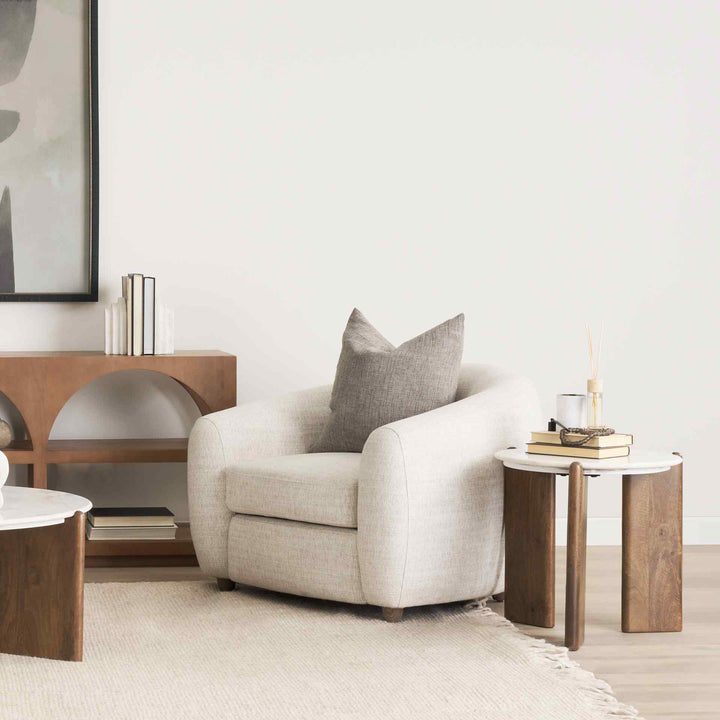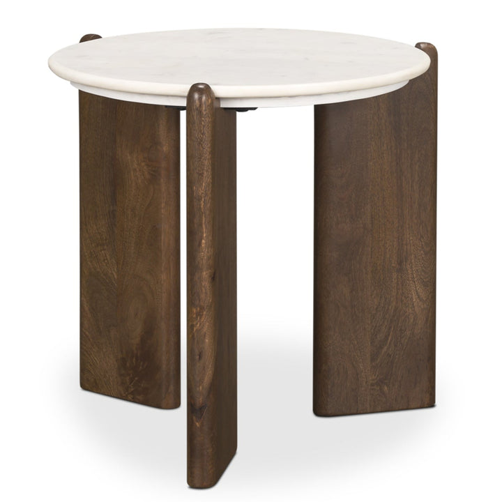 The Rumer Side Table brings a touch of elegance to any room. Made with three solid mango wood legs, it has a rich dark brown finish that contrasts beautifully with the smooth white marble top. The marble features gray veining, making each table unique. Its contemporary shape adds a stylish touch to your home, serving as both a statement piece and a practical addition. Whether used to display decorative accents or as a stable surface for daily essentials, this side table effortlessly enhances your room's ambiance.