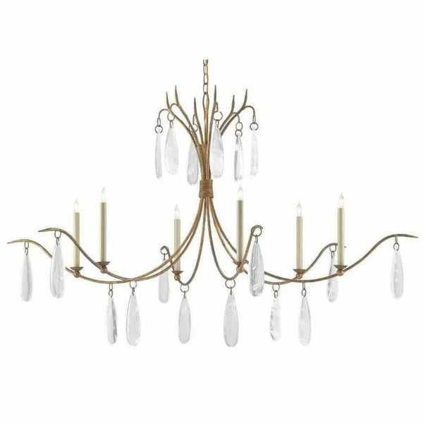 At nearly five feet in diameter, the Marshallia showcases Currey & Company's signature artisan metalwork -- each slender arm is hand-forged from wrought iron and finished in rustic gold leaf that develops subtle patina over time. The faux rock crystal pendants are individually selected and positioned to maximize light refraction, while six candle-sleeve bulbs provide warm ambient lighting that flatters both faces and food at the dining table.