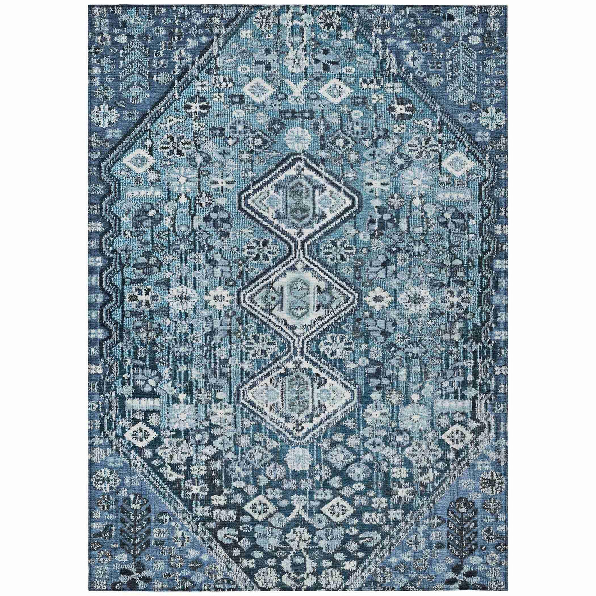Step into style with the Saelain Blue Washable Rug. This rug is designed with three diamond medallions, interwoven with intricate motifs, all set in a striking Aztec pattern. Its vibrant blue color not only brings a touch of elegance to any space but also blends effortlessly with various decor styles. Whether placed indoors or outdoors, its UV stabilization ensures that it maintains its color and beauty even in the sunniest spots. The ultra-thin profile allows it to fit seamlessly into any setting, making it a versatile choice for any room or outdoor space.