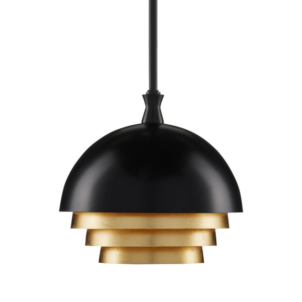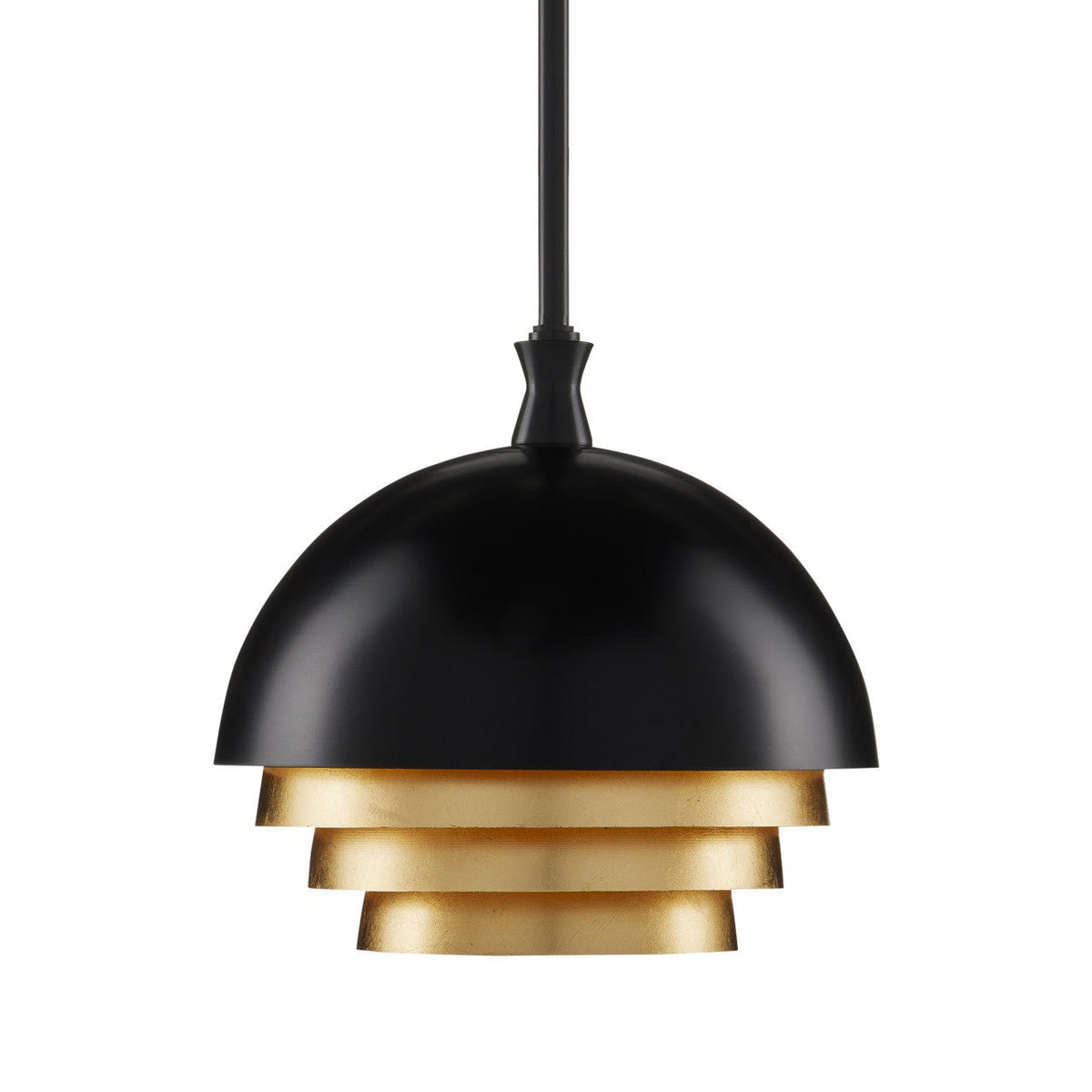 The cascading forms that make up the shade of the Salviati Pendant are fashioned from steel in a contrasting mix of deep black and luminous gold leaf. Telescoping rings are inserted into the larger dome in a way that allows the illumination to reflect on each of the gold surfaces for an enhanced glow. The simplicity of the stem and hardware from which it hangs heightens the contemporary feel of this black pendant.