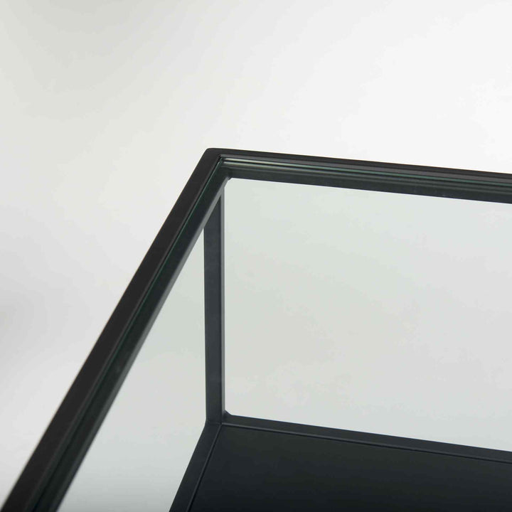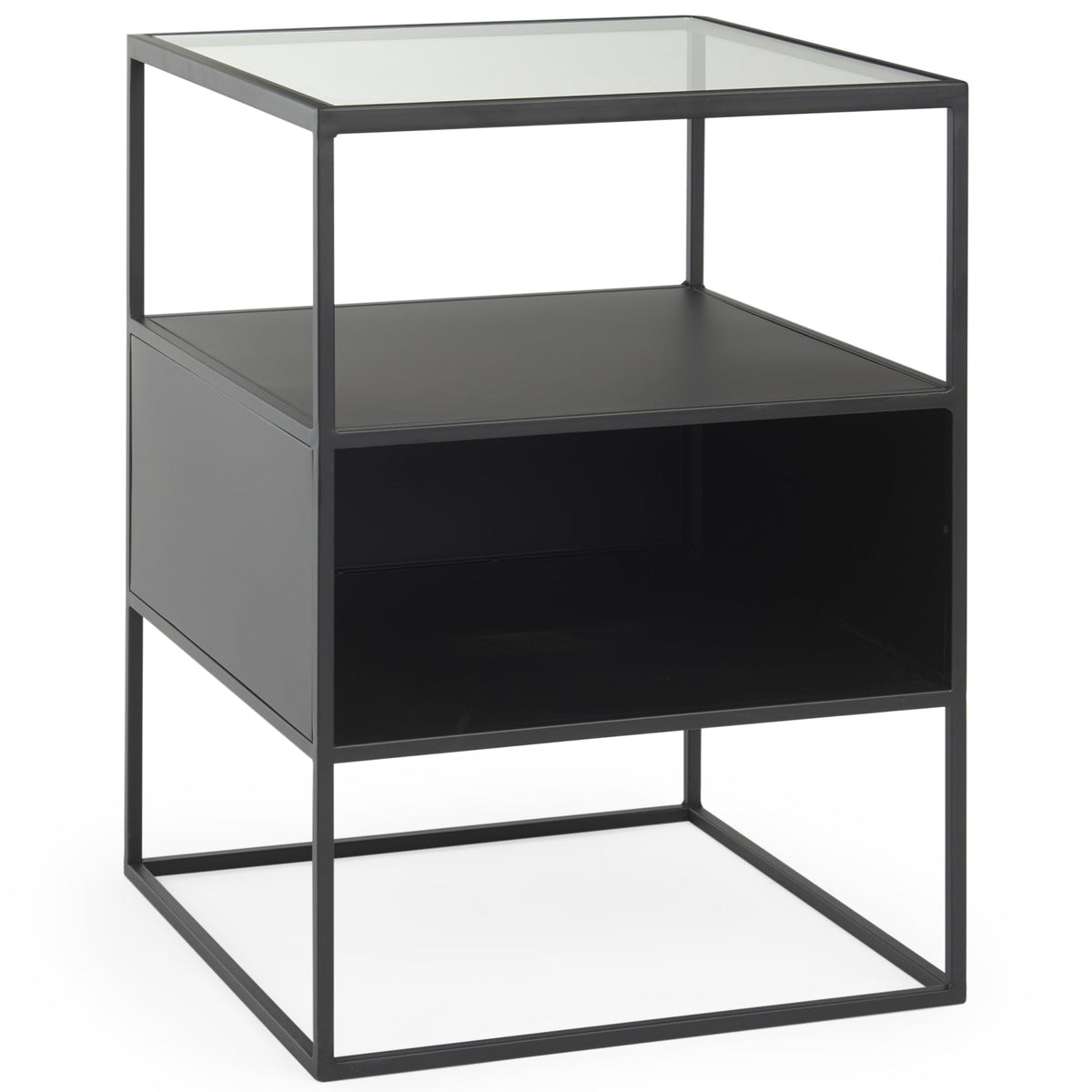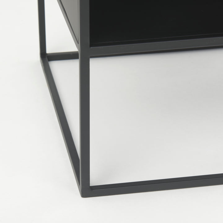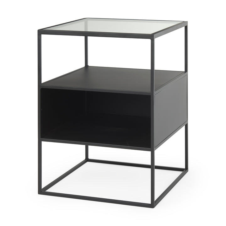 Enjoy the modern appeal and clean lines of the Samson Glass Top Square Side Table. Crafted for those who appreciate simplicity, this side table boasts a sleek iron frame with a matte black finish, embodying minimalist design at its finest. The tempered glass top adds a touch of contemporary style, enhancing its elegant presence in any room. Beneath the glass lies a bold matte black iron compartment, perfect for tucking away essentials and keeping your space tidy.