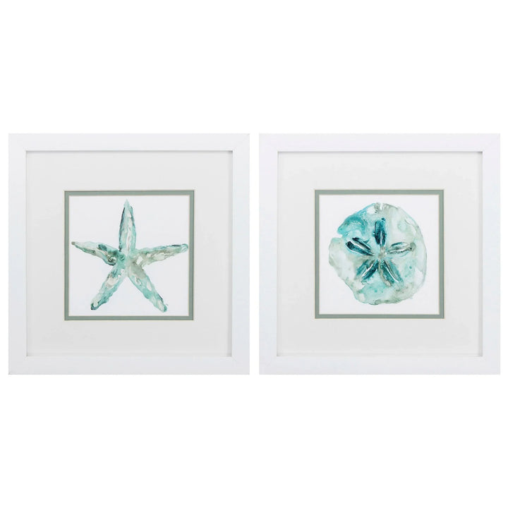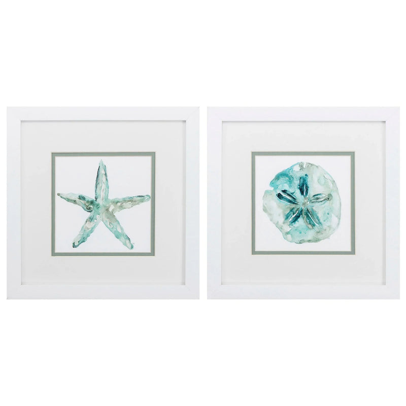 Enhance your living space with the Sandstar S/2 Coastal Art Set. This beautiful art set includes two pieces, each showcasing a vibrant turquoise watercolor design featuring starfish and sand dollars. The coastal theme adds a relaxing touch to any room, ideal for those who love the sea. The images are double matted, providing a sophisticated look that enhances the overall aesthetic. The white frames complement the artwork, creating a clean and crisp presentation that fits seamlessly into various decor styles.