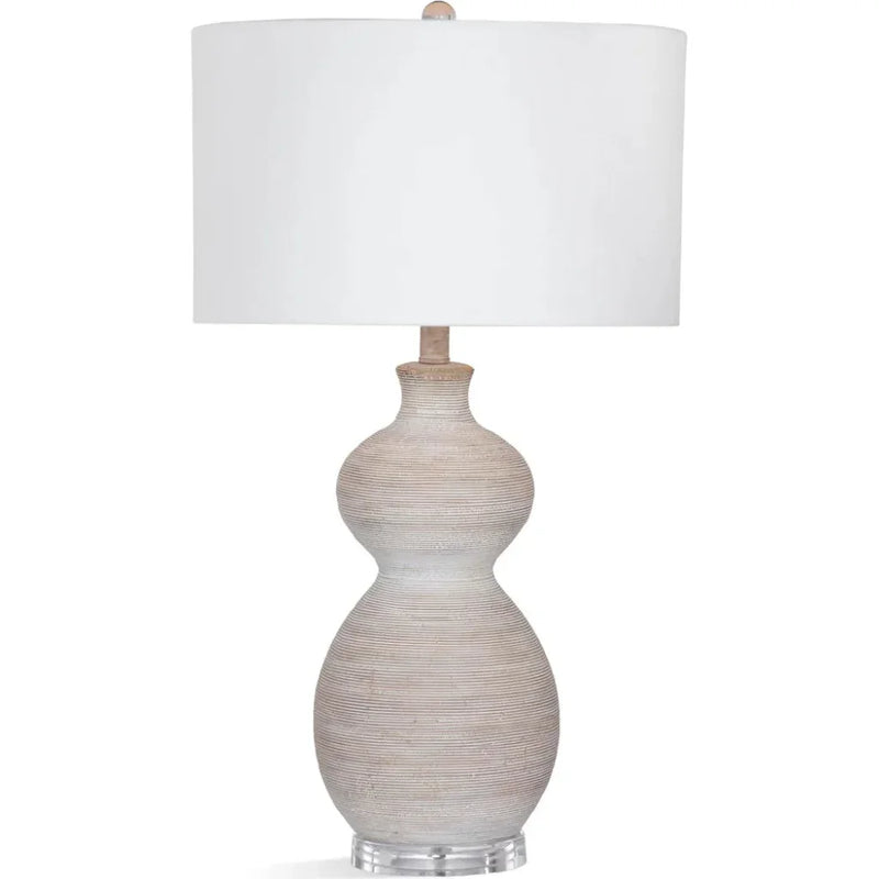 The white washed, beige ceramic lamp base and horizontal texturing provides boho styling.