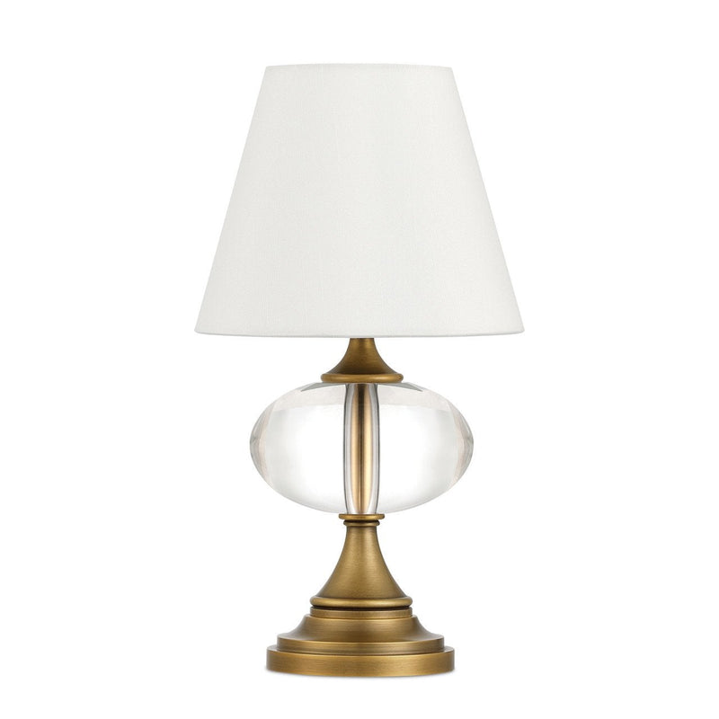 The Sashay Brass Cordless Table Lamp features an oblong optic crystal globe intersected by a slender metal stem, both decorative and structural. The metalwork is finished in polished antique brass, complementing the clarity of the crystal detail. A white hardback shade tops the lamp, which is powered by a rechargeable bulb for convenient cordless use. The fixture is dimmable.