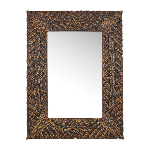 The Schwarzwald Mirror features a substantial wood frame intricately carved with pomegranate and acanthus leaf motifs. Finished in antique gold to resemble aged metal, the frame adds richness and texture. Measuring 48 by 36 inches, this mirror makes a bold decorative statement and fits within a botanical-inspired trend story. Due to the artisanal finish, the surface of each mirror could differ slightly.
