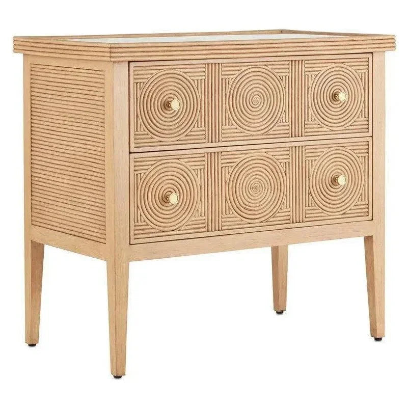 Elevate your living space with the luxurious and sophisticated Santos Chest. Indulge in its intricate craftsmanship, featuring a hand-applied split rattan pattern and a Sea Sand finish on a solid mahogany frame. The drawers and top showcase a stunning split rattan pattern, while the brass pulls add a touch of elegance in the center of the outer circles. Each piece is carefully handmade and boasts a Sea Sand on Rattan finish.