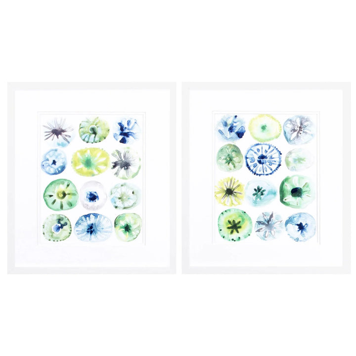 Enhance your space with a touch of coastal charm through this set of two sea urchin prints. These art pieces feature abstract watercolor designs in calming shades of blue, green, and yellow. Each print is double matted and encased in a sleek, modern white frame, making them a versatile addition to any room. The combination of vibrant colors and modern style allows these pieces to complement both contemporary and traditional décor, bringing the serene beauty of the ocean into your home.
