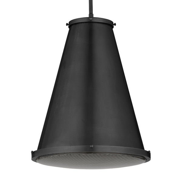 The Seafarer Pendant is made of brass in matte black and antique brass finishes with a clear pebbled glass diffuser. Its flared shade is detailed with understated fasteners that give the design a subtle nautical character. This fixture is dimmable.