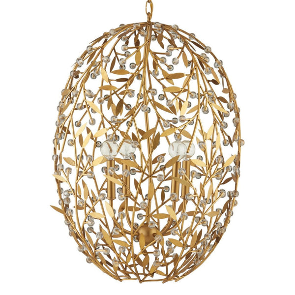 Botanical motifs in high-end lighting solve the modern challenge of bringing natural beauty indoors without sacrificing sophisticated design. The Currey & Company Secret Garden Gold Chandelier is a 20.5-inch nature-inspired globe pendant designed for dining rooms, bedrooms, and entryways seeking organic elegance, available at LOOMLAN with free shipping to the continental US. This handcrafted wrought iron fixture transforms traditional vine and leaf patterns into contemporary luxury through hand-applied gold leaf finishing and strategically placed crystal beads that catch and refract light throughout the day. At nearly 29 inches in overall height with adjustable hanging options from 35 to 103 inches, this chandelier bridges the gap between natural inspiration and refined metalwork that defines premium artisan lighting.