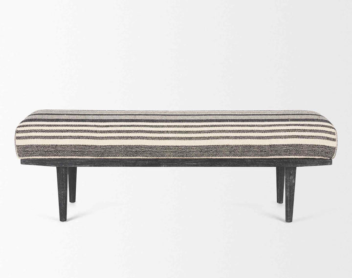 The Shae Bench brings a sleek touch to any room with its modern design. Upholstered in high-quality black and white fabric, this bench offers a soft and inviting seat. The luxurious padding ensures comfort, making it a perfect spot for relaxation. The solid wood frame is enhanced with a black stain and gentle white wash, highlighting the natural grain pattern. This combination of elements gives the bench a stylish and contemporary look that stands out in any setting.