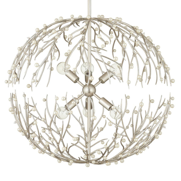 Spherical chandeliers with organic artisan details challenge traditional perceptions of formal lighting by introducing nature's asymmetrical beauty into polished interior spaces. The Currey & Company Shinju Pearl Orb Chandelier is a 25.5-inch Contemporary Silver Leaf spherical fixture designed by Aviva Stanoff that captures the essence of underwater landscapes through hand-forged wrought iron branches adorned with fresh-water pearls, available at LOOMLAN with free shipping to the continental US. This is designer collaboration lighting where handcrafted metalwork meets the organic luminescence of authentic pearls, creating a fixture that reflects light in patterns as unique as ocean currents. Each fresh-water pearl catches and refracts light from the six bulbs differently, creating subtle light variations that shift throughout the day. At 25.5 inches in diameter and adjustable from 30 to 72 inches in drop height, this chandelier suits mid-sized dining rooms, bedrooms, and entryways where its organic elegance can serve as both functional lighting and sculptural statement.