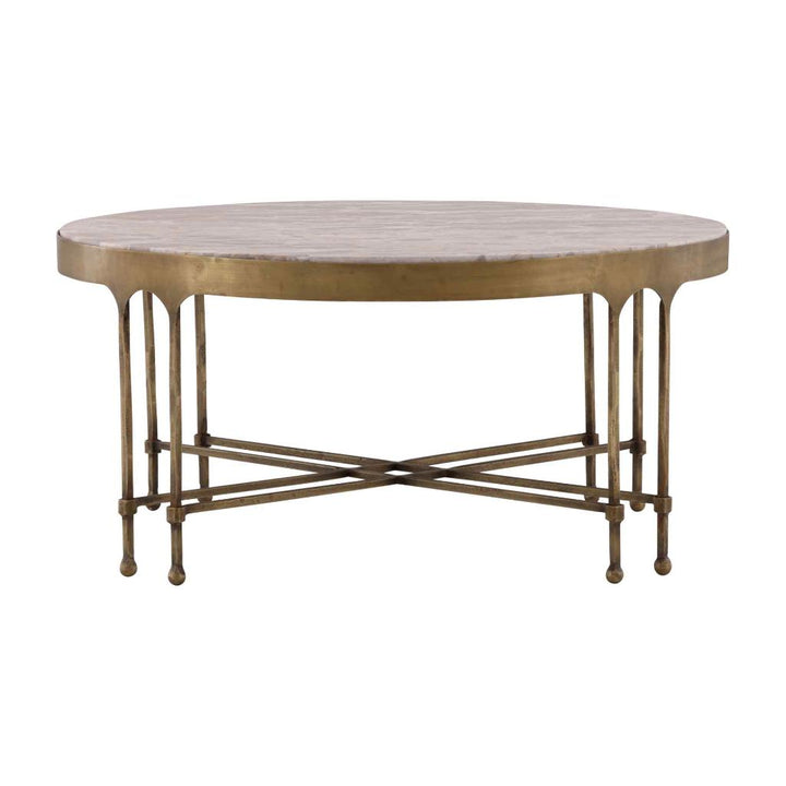 The Shirley Coffee Table is a perfect blend of elegance and natural beauty. Its brushed gold iron base adds a touch of modern grace, while the marble inlaid top showcases soft hues of yellow, beige, and tan, making each piece unique. This table serves as a stunning focal point in any room and pairs beautifully with various interior styles. Its round shape and thoughtful design allow it to fit seamlessly into different spaces. Pair it with the Shirley End Table for a consistent and elevated look. Experience timeless sophistication and versatile style with the Shirley Coffee Table.
