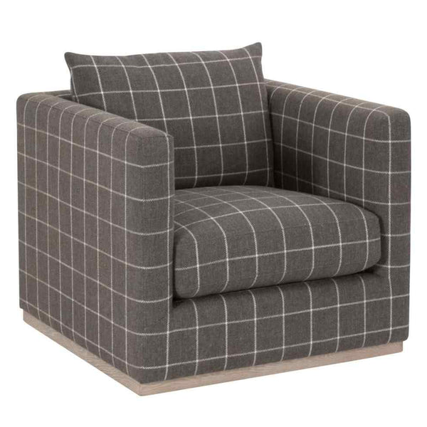 The Siena Plinth Base Swivel Club Chair combines comfort with a touch of elegance. Built with a solid oak wood frame in a natural gray oak finish, it showcases an exposed plinth wood base that adds a stylish touch. Upholstered in a high-performance windowpane steel fabric, this chair is both stain-resistant and eye-catching. It features a 360° swivel for easy movement and has removable and reversible seat and back cushions. The cushions are filled with a luxurious blend of down and polyester, providing plush comfort. The chair's transitional style and plaid-like pattern make it a standout piece in any room.