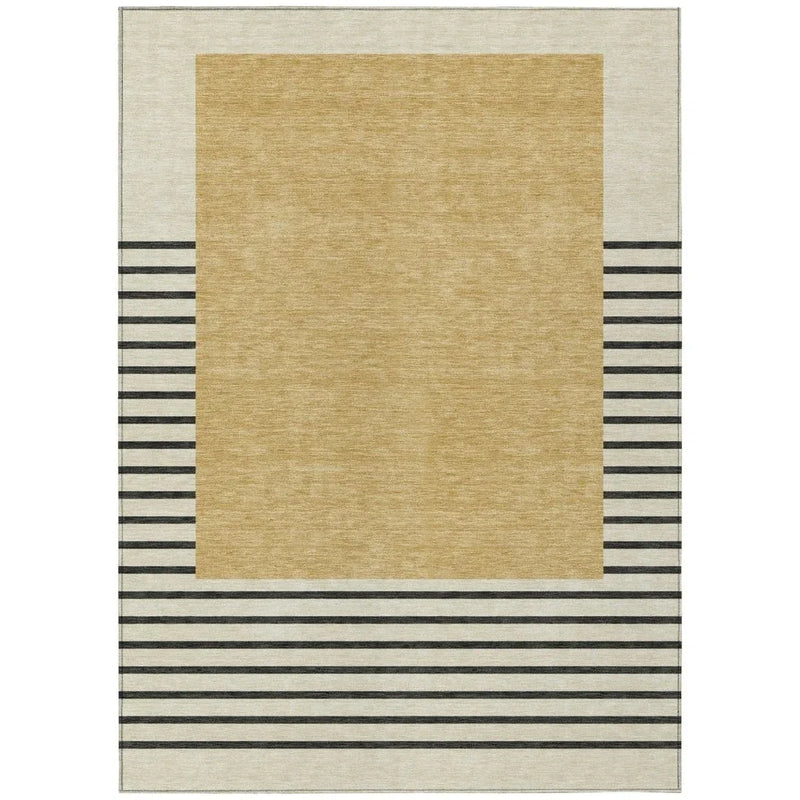This elegant rug features vertical stripes with a large rectangle at the center, adding a refined touch to any space. Its timeless design complements a wide range of decor styles, making it a versatile choice for your home. Made from durable polyester, the rug is both stain-resistant and family-friendly, ensuring it holds up well in busy households with kids and pets. Its gold color adds a warm and inviting feel, enhancing the comfort of any room.