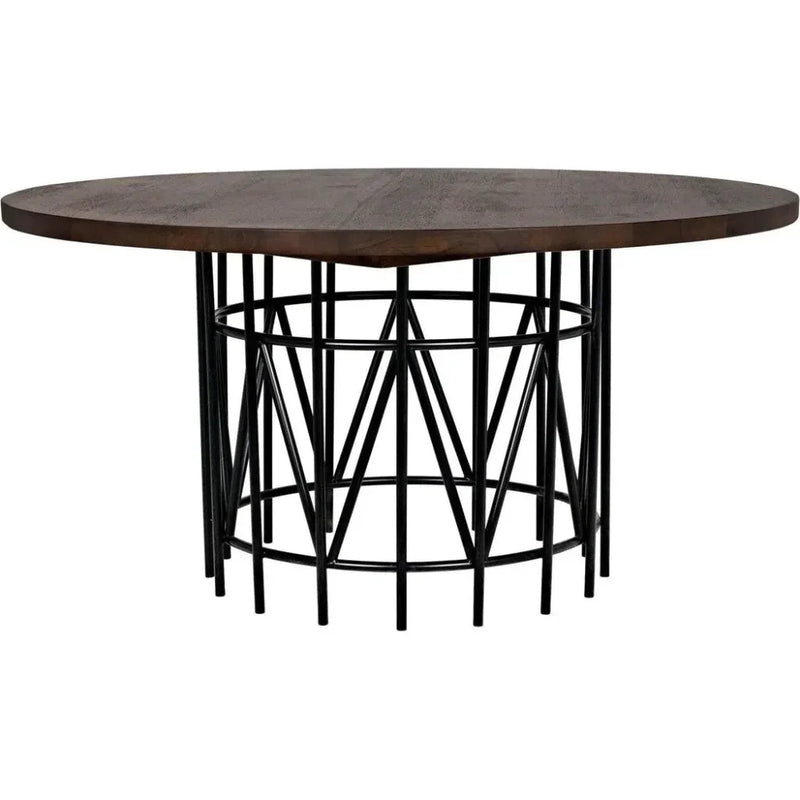 Introducing the Silberman Dining Table, a sophisticated and sturdy dining solution. With its rich dark walnut finish and a sturdy, versatile base made of tubular steel in matte black, this 60" pedestal table offers maximum stability and a touch of elegance to your dining room. Add elegance and stability to your dining room with the Silberman 60" Pedestal Dining Table in dark walnut. This table features a sleek carousel-style base made of matte black, tubular steel, paired with a sophisticated dark walnut finish. Its durable design ensures maximum stability, making it the perfect dining solution.
