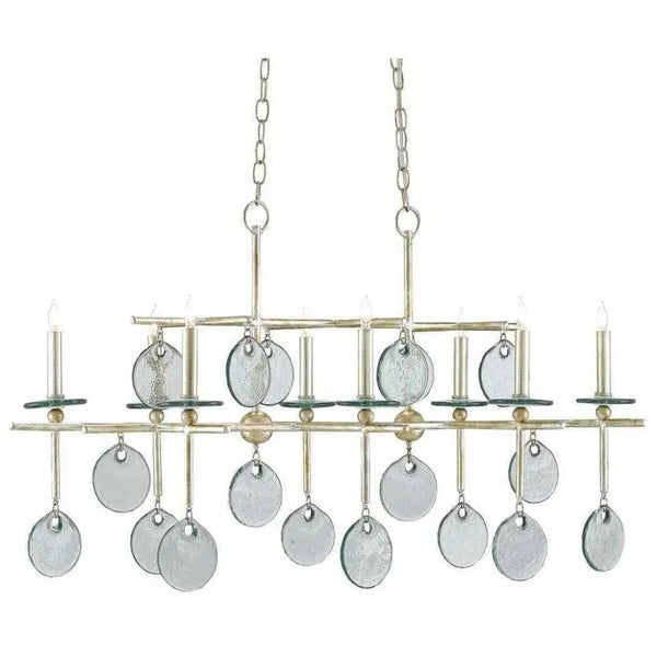 Modern dining rooms and kitchen islands with clean architectural lines need lighting that balances industrial sophistication with warm livability. The Currey & Company Sethos Silver Rectangular Chandelier is a 23"x42" modern linear chandelier featuring wrought iron frame and recycled glass elements, designed for contemporary spaces that demand both artisan quality and sustainable materials, available at LOOMLAN with free shipping to the continental US. This eight-light fixture combines the raw appeal of hand-forged metal with the environmental consciousness of recycled glass, creating a statement piece that anchors modern interiors without overwhelming them.