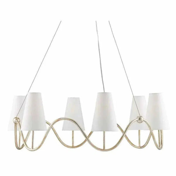 Our Kadir Chandelier is made of wrought iron in a silver Granello finish. The wave-like ring that holds the off-white linen shades covering the six lights is ornamented with tiny globes where the hardware meets the band. The silver chandelier illustrates the talent our artisans have for creating gleaming finishes. Adjustable from 50.5" to 123" with use of included chain/rod kit/cable. If your space calls for a longer drop, additional chain/rods/cable is available for purchase.