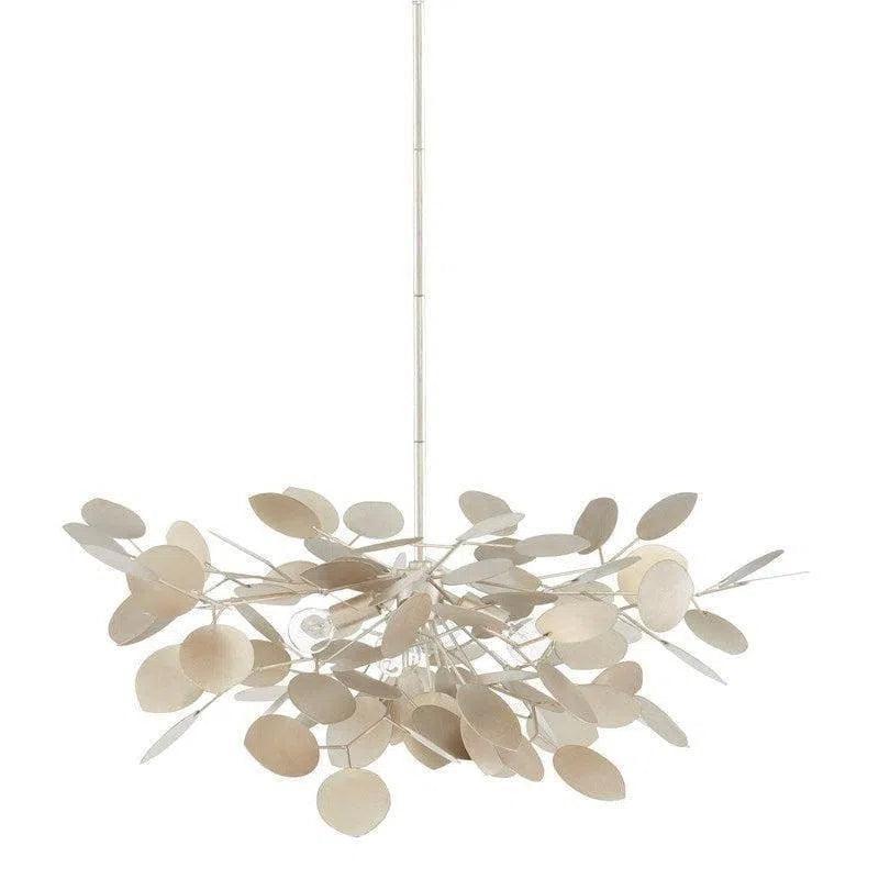 With a lyrical profile of fluttering discs that favor the leaves of its namesake plant, the Lunaria Small Chandelier is made of wrought iron in a contemporary silver leaf finish. The bulbs that are sprinkled amongst the flowing petals of metal reflect off the finish on this silver chandelier to increase the glow. Adjustable from 19" to 61" with use of included chain/rod kit/cable. If your space calls for a longer drop, additional chain/rods/cable is available for purchase.