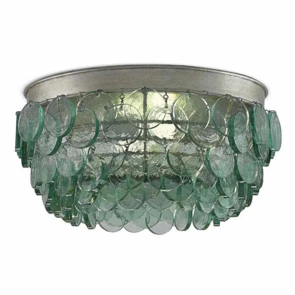 Recycled glass discs dangle from the Braithwell Flush Mount to form a textural shade. The discs vary in size and overlap on the wrought iron frame in a silver leaf finish of the to make this green glass flush-mount a mottled mosaic.