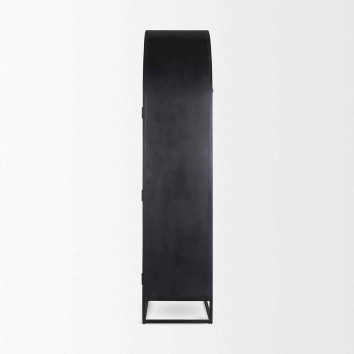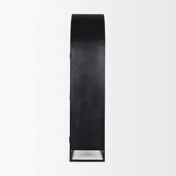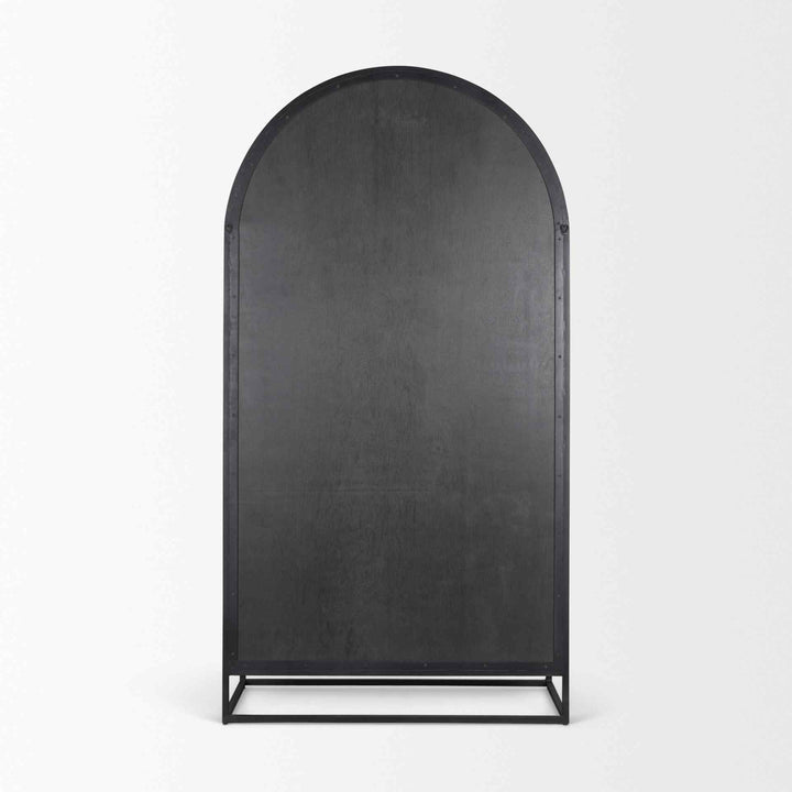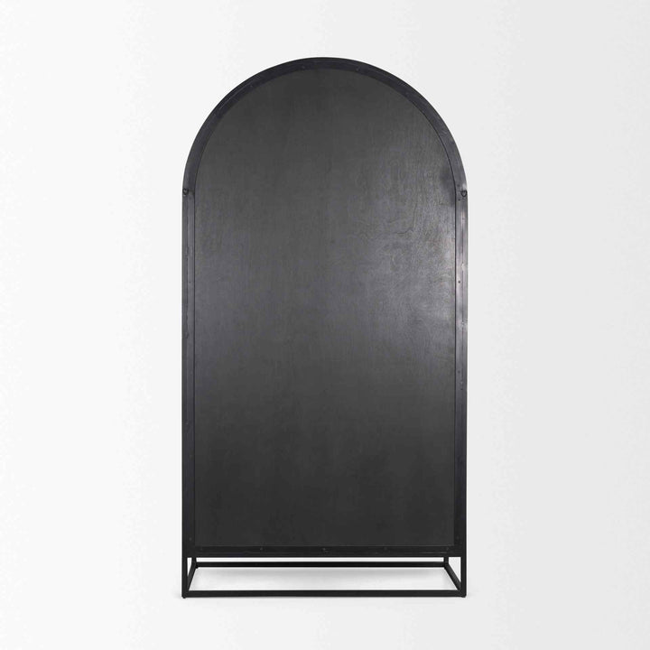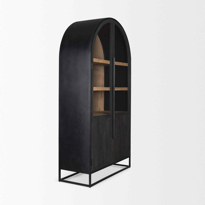- Sloan's arched cabinet doors feature black wood and smooth, clear glass
