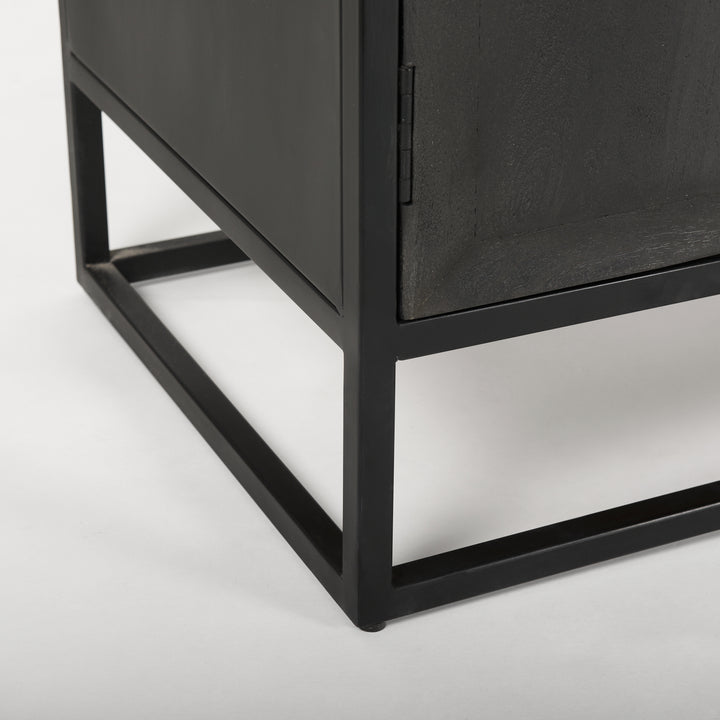 - Constructed from a matte black iron metal frame that encases a warm, light brown mango wood interior with black mango wood doors and smooth, clear glass.