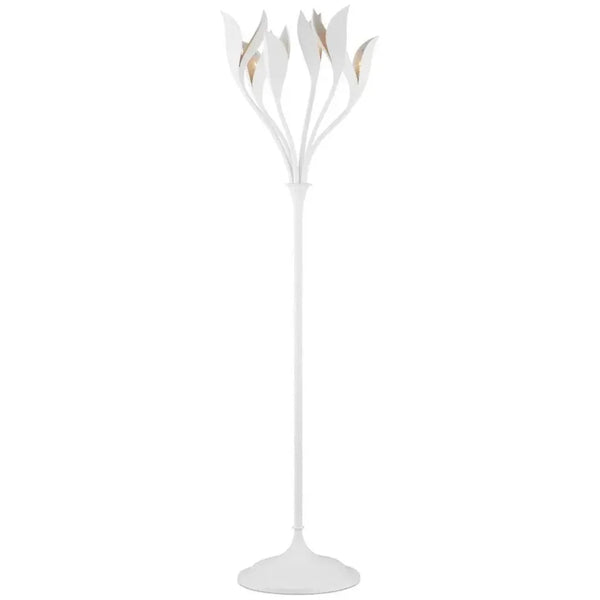 The big, beautiful blossoms of the Snowflower Floor Lamp and the body they flow up from are made of wrought iron in a gesso white finish. Unfolding toward the ceiling, the undulant petals direct the light upward. The pale finish that flows into the interiors of the blooms turns warm when the bulbs illuminate it. The white floor lamp with its wild botanical personality has a foot switch for ease of turning it off and on.