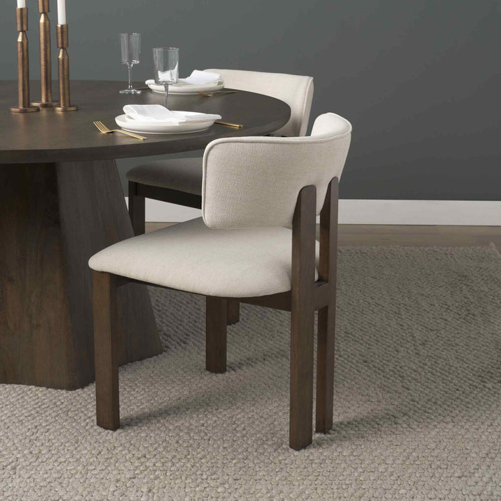 The Soho Dining Chair combines a sculptural design with a modern touch, making it a standout piece in any dining room. Its double-beamed open back and unique tripod-style frame add an artistic flair, while the creamy chenille fabric offers a soft, inviting feel. Made from kiln-dried rubberwood with a dark brown finish, this chair is both sturdy and stylish. Its OEKO-TEX® certified upholstery ensures safety and comfort, allowing you to enjoy dining with peace of mind. With its minimalist design and neutral tones, the chair effortlessly enhances modern and sophisticated dining spaces. No assembly needed, it’s ready for use right away.