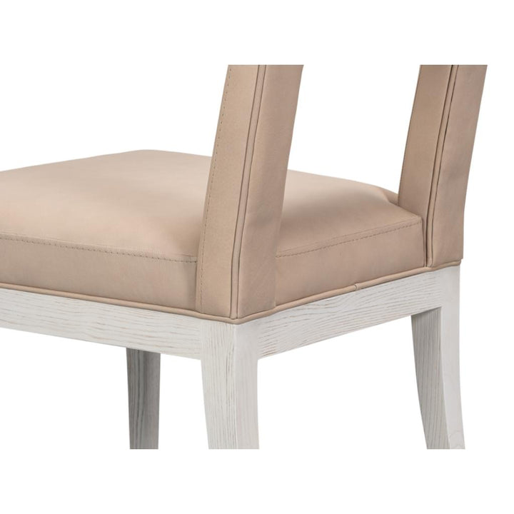 The Solace Dining Chair offers a blend of comfort and style, perfect for any dining space. Crafted from durable ash wood, this chair presents a light brown color that complements various decors. Its contemporary design fits well in modern settings, while the cream fabric and bail bone aniline leather add a touch of elegance. This armless chair is not only stylish but also practical, providing a comfortable seating experience. The quality materials ensure long-lasting use, making this chair a valuable addition to your home. Enjoy meals and gatherings with the Solace Dining Chair, designed to enhance your dining experience.
