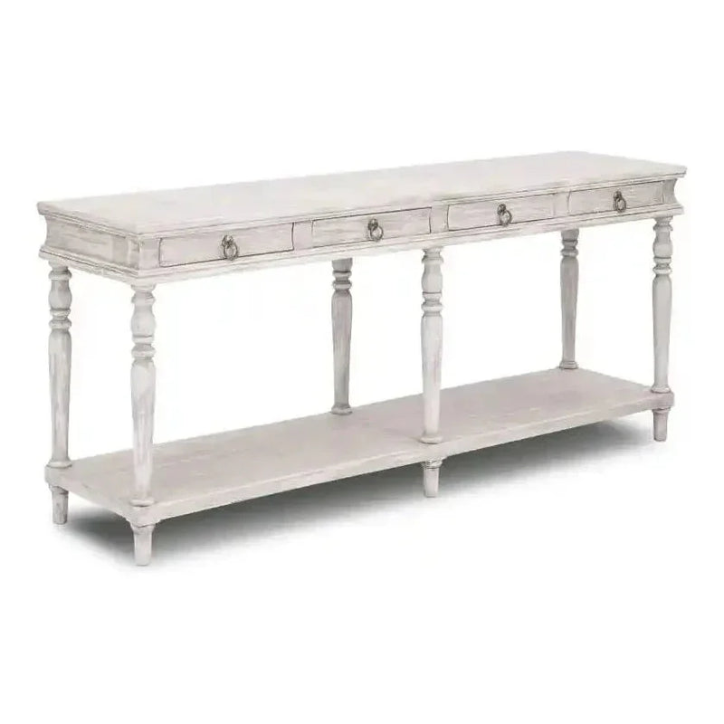 This simple farmhouse style console captures the essence of simplicity, yet it offers craftsmanship throughout its design. narrow turned legs with bun details and rings are paired with a bull nosed drawer skirt to offer depth. its finish is the result of highly skilled artisans at its best, giving it the right amount of off-white distressed tone over the natural Wood color.