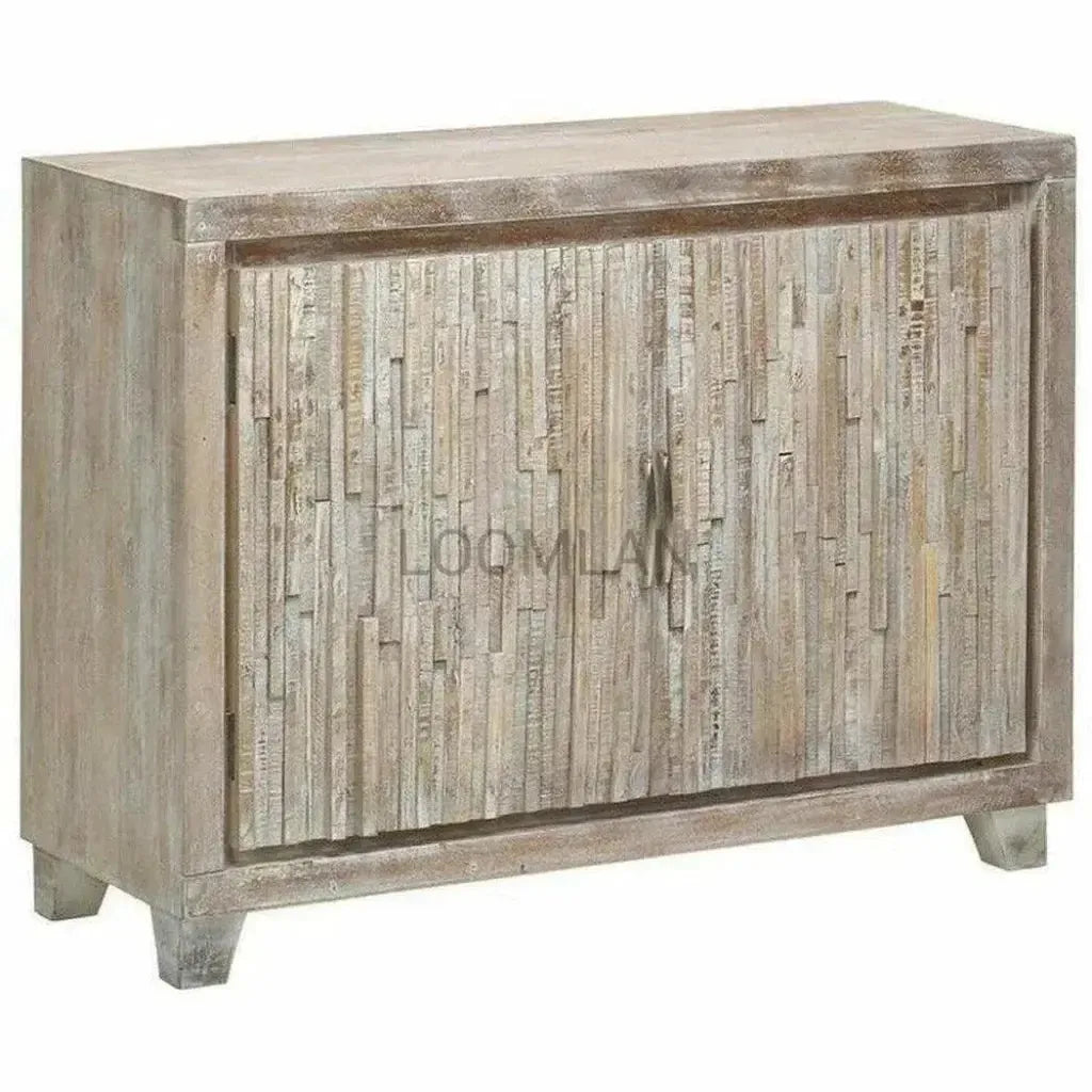 Elevate your home decor with the luxurious Malessa accent cabinet. Meticulously handcrafted using the tongue and groove technique and featuring a water-resistant lacquer and whitewash finish, this one-of-a-kind piece is adorned with handset wood strips for a stunning "3D" effect. With a spacious interior, bar-style pulls, and hidden storage options, this off-white cabinet adds elegance and functionality to any room. Experience expert craftsmanship and unique design with the Malessa collection, perfect for transforming your space into a sophisticated haven.