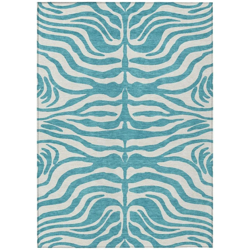 Enhance your living space with this captivating zebra-patterned area rug. The bold design adds a touch of exotic flair, seamlessly integrating with various decor styles. Its vibrant teal hue offers a refreshing pop of color to any room or outdoor area. Crafted from durable polyester, this rug is designed to withstand the elements, making it ideal for both indoor and outdoor use. Enjoy the convenience of its ultra-thin construction, which is perfect for low-profile areas and ensures quick drying after cleaning or rain.