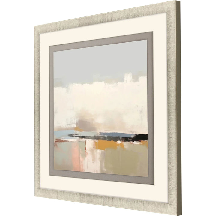 Experience a serene touch in your living space with this beautiful piece of art. This contemporary art print is a subtle landscape that brings a sense of calmness and sophistication to any room. Raised and mounted on a premium mat, the artwork showcases muted colors of cream, gray, beige, black, and coral. The horizontal composition is enhanced by textured and layered designs, creating a modern and elegant aesthetic. The off-white and light gray mats add depth, perfectly complementing the piece's overall look.