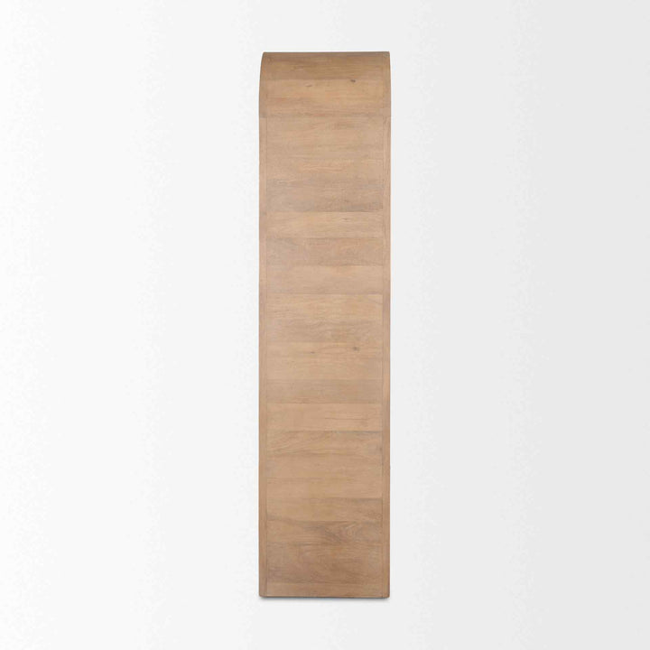 The Sorina Light Brown Wood Bookcase is a beautifully crafted piece that blends style with function. Made from solid mango wood, it features a light brown finish that highlights the natural beauty of the wood. Each of the four CNC-designed doors showcases a unique reverse fluted pattern, adding depth and texture to its appearance. With its recessed handles, the bookcase maintains a seamless look that fits effortlessly into modern living spaces. This piece is versatile, offering ample storage with two fixed and two removable shelves, making it a practical choice for organizing and displaying books, decor, and more.