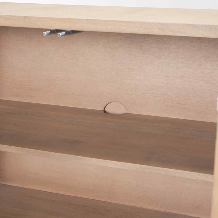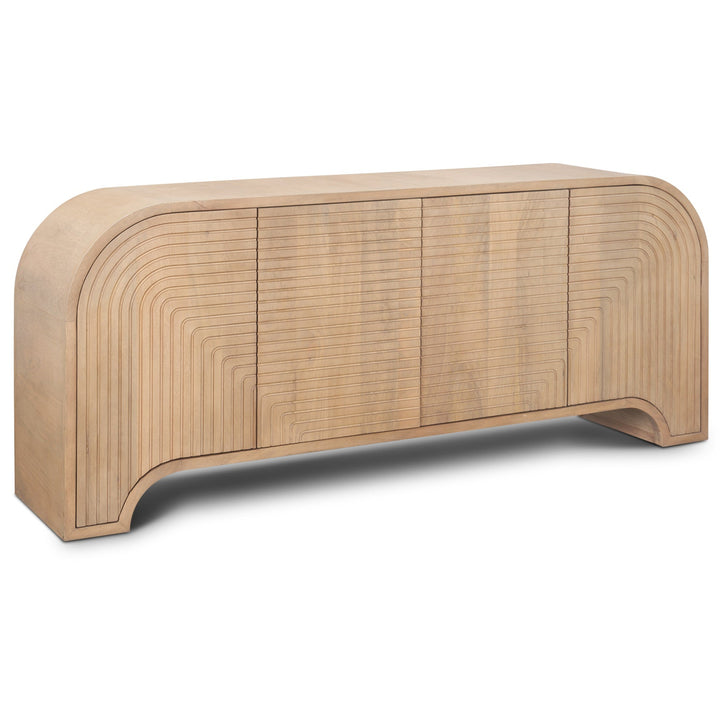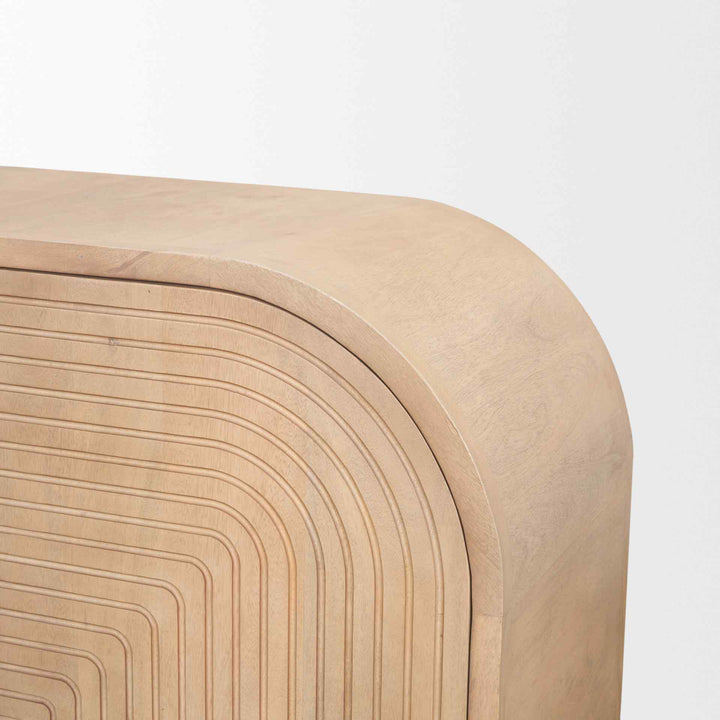Introducing a stunning blend of style and utility, this sideboard combines modern aesthetics with practical storage solutions. Crafted from solid mango wood, it boasts a light brown finish that highlights the natural grain and unique variations of the wood. The reverse fluted design on the doors adds an elegant texture, enhancing the sideboard's visual appeal. The recessed handles are seamlessly integrated, ensuring a sleek, uninterrupted look that complements its contemporary curves.