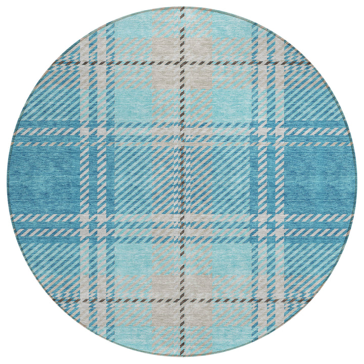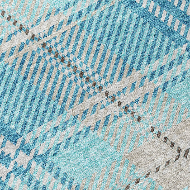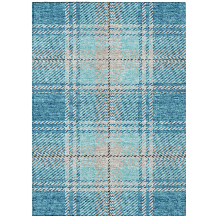 Enhance your living space with the Spiral Whispers Teal Washable Indoor-Outdoor Rug. This stylish rug features a timeless plaid pattern created with both horizontal and vertical lines, fitting perfectly into transitional settings. Made entirely of 100% polyester, it is designed to withstand both indoor and outdoor conditions, thanks to its UV stabilization. The ultra-thin profile of the rug not only offers a sleek look but also allows it to dry quickly after rainy days. It's machine washable, making it ideal for homes with kids and pets. Bring both elegance and practicality to your home with this versatile rug.