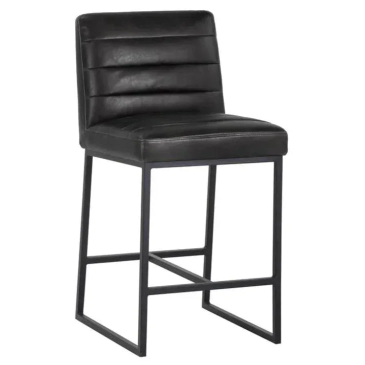 Create a sophisticated and contemporary counter seating area with these masculine and modern counter stools, each featuring horizontal channel tufting on the interior seat and seatback, complemented by a sleek black powder-coated steel frame. The Coal Black faux leather option offers a sleek and dramatic choice, ideal for sleek, minimalist interiors. For a warmer ambiance, the Havana Dark Brown faux leather provides a rich, inviting tone that pairs well with darker wood finishes. Opt for the Overcast Grey faux leather for a cool, urban aesthetic that suits modern decor themes, or choose the Tobacco Tan faux leather for a warmer, rustic feel. These stools are versatile and suitable for various dining, kitchen, and bar spaces of all sizes, emphasizing both style and durability. Pair them with minimalist countertops and ambient lighting to create an inviting yet contemporary atmosphere, perfect for modern living spaces.