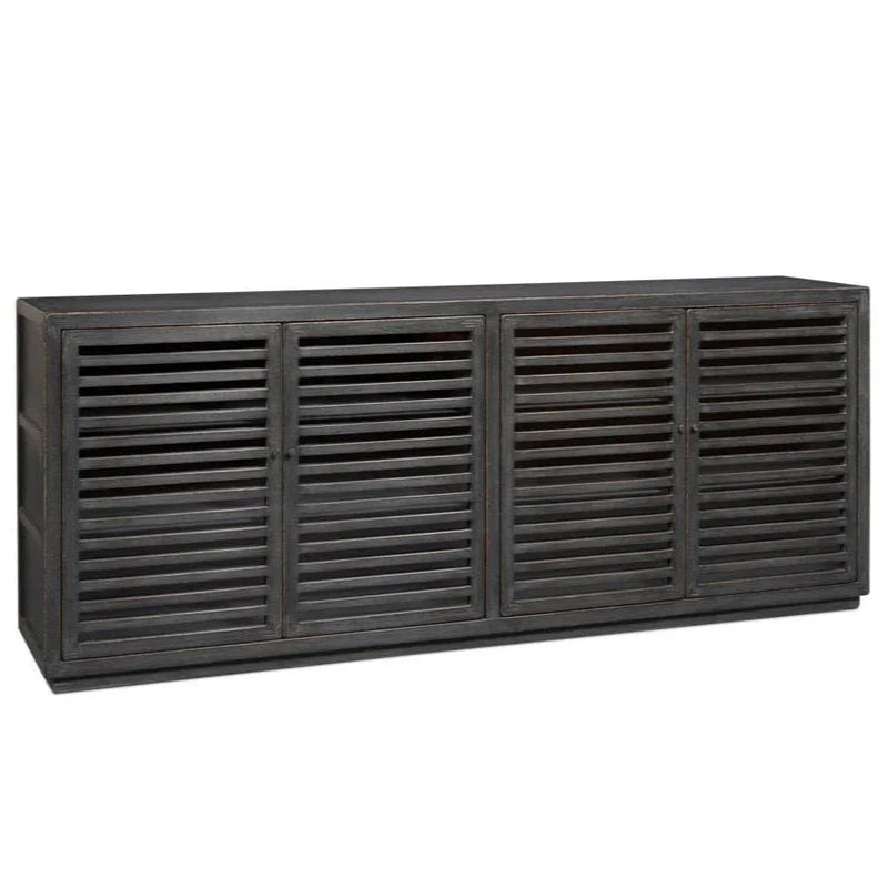 The St Lucia Matte Black Wood Sideboard combines practicality with refined design. Crafted from reclaimed pine, it offers durability alongside an eco-conscious appeal. Its intricately carved doors, highlighted by a contrasting painted finish, create a striking centerpiece for any room. Inside, six fixed shelves provide generous storage, perfect for organizing dining essentials, linens, or decorative items. The sideboard’s transitional style harmonizes effortlessly with both modern and rustic interiors. Featuring solid construction, a distressed dark wood finish, horizontal slats, and metal knobs, this piece adds character and warmth while serving as a functional and elegant storage solution.