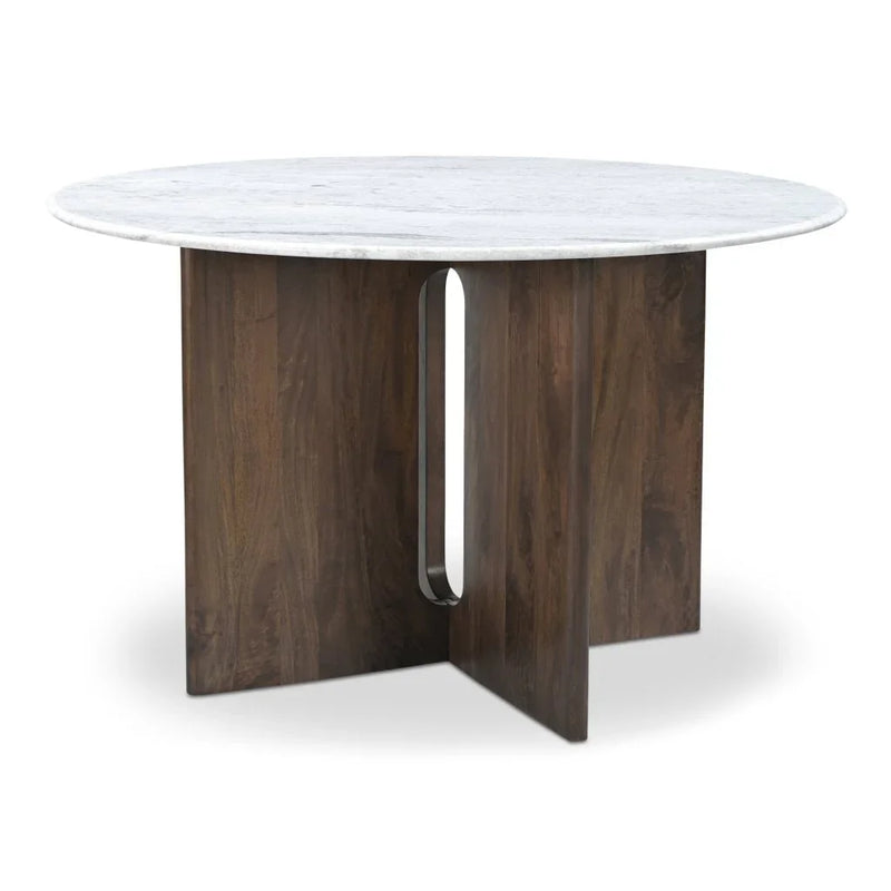 The Stanley Dining Table brings together style and function with its eye-catching design. Available in two variations, the table features a stunning marble top in Giana Grey Marble or a solid mango wood top, both designed to provide strength and beauty. The marble top showcases natural veining unique to each piece, while the mango wood's rich brown finish highlights the beautiful grain patterns. Both versions of the table feature a unique cross base with artfully carved arches at each end, adding a sense of lightness to the solid structure. Perfectly sized for small gatherings, this table comfortably seats four, making it ideal for everyday meals or special occasions.