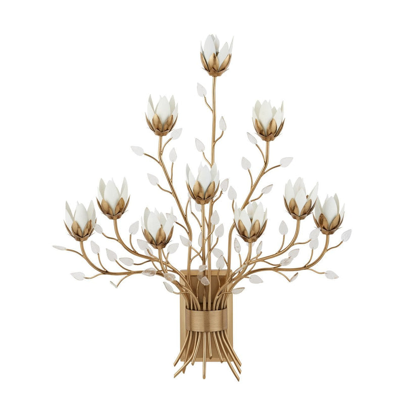 The floral artistry of the Star Magnolia Wall Sconce is created by its upwardly flowing beauty and impressive scale. The metal elements that ground the gold sconce are covered in an antique brass finish, while the blossoms extending from the outer leaves are finished in white. The smaller leaves fluttering from the branches are made of pressed glass, each of them handmade. Portions of the metal have been hand-hammered to add subtle texture to surfaces. This 10-light fixture is dimmable; and the surface treatments may vary slightly from sconce to sconce.