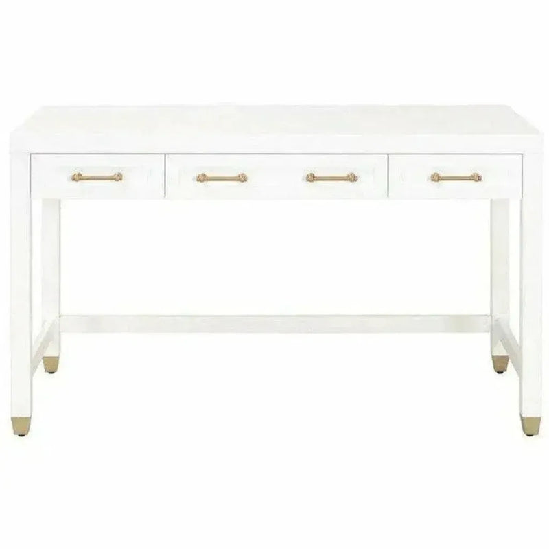 Transform your work area with the breathtaking Stella Desk. Its transitional design and Matte White polish exude class and refinement. Three generously-sized drawers provide ample storage, while the Brushed Brass embellishments bring a touch of luxury. This exclusive piece effortlessly merges style and practicality. The Stella Desk is the epitome of elegance and sophistication, featuring a transitional design and lavish Matte White finish. With its three spacious drawers, this desk offers both style and functionality for all your storage needs. Elevate your workspace with this exceptional item. Transitional in style, this desk boasts a Matte White finish with Brushed Brass accents and three spacious drawers for optimal storage. Exuding sophistication, this desk is the perfect combination of style and function.