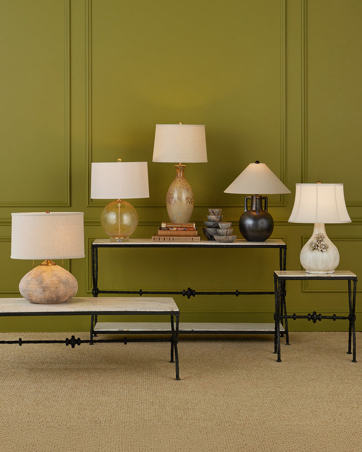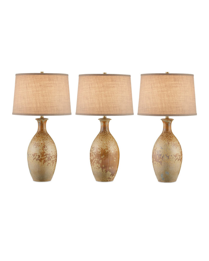 The Stellata Table Lamp stands out with its unique crystallized design. This lamp is made from ceramic and sports a richly speckled surface. The effect is achieved by a special crystallization process where multiple layers of glaze create tiny crystals on the surface. This process gives each lamp a one-of-a-kind appearance, making no two lamps exactly alike. The lamp's surface is adorned with brown, beige, and blue mottled patterns, which come together to form warm, earthy tones. This combination adds depth and visual interest to any room, creating a cozy and inviting atmosphere.